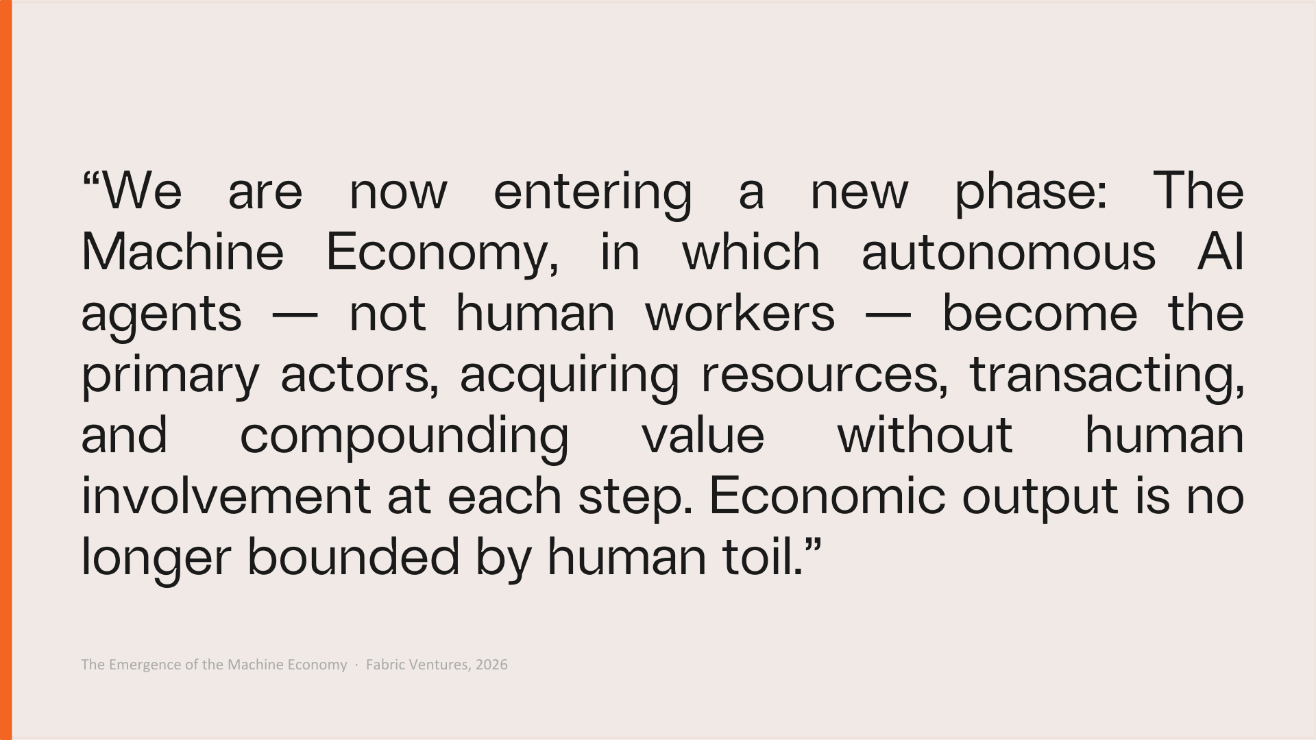 This will reshape society over the coming decades. Fabric backs the architects of this transition: the builders of digital infrastructure and the applications that run on it, in a world that is machine-driven but yet human-centric. This is an evolution of our longstanding focus on the open economy, an economy that protects individual sovereignty of identity, money and data, and keeps opportunity open to all. AI was always the prime application for this vision. We considered calling it the ‘AI economy’ or the ‘agentic[1] economy’, but settled on ‘machine’. Words matter : the Greek root mēkhanēs from which we inherit 'machine' carries the sense of a ‘contrivance that overcomes constraint’; something the Romans crystallised in the Latin ‘machina’, a ‘divine problem solver’. The Romans literally employed a crane that allowed a ‘god’ to descend to the stage and intervene to resolve the intractable plot of a play. Thus, Aphrodite rescued Paris from Menelaus mid-battle, the Great Eagles rescued the Hobbits from Mount Doom and (unintentionally) bacteria rescued humanity from the Martians in ‘War of the Worlds’. This is the ‘deus ex machina’. The crane has been rebuilt in silicon, at civilisational scale, and the gods now descending are autonomous agents.
