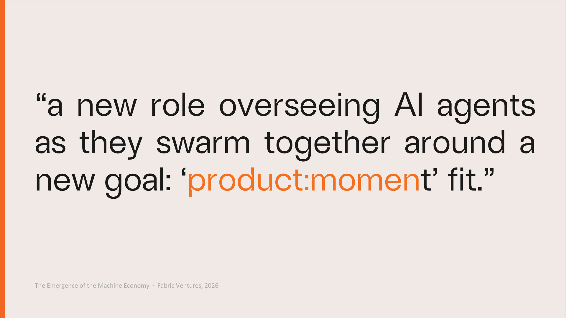 Fabric Ventures's conviction is that durable value will not accrue to any single model or application: both are commoditising faster than most investors have registered. It will accrue to the coordination infrastructure beneath them: programmable capital markets, machine infrastructure networks, and agent trust systems that let agents transact, be trusted, and compound. We have backed founders across multiple waves of picks and shovels. This gold rush will dwarf anything before it.