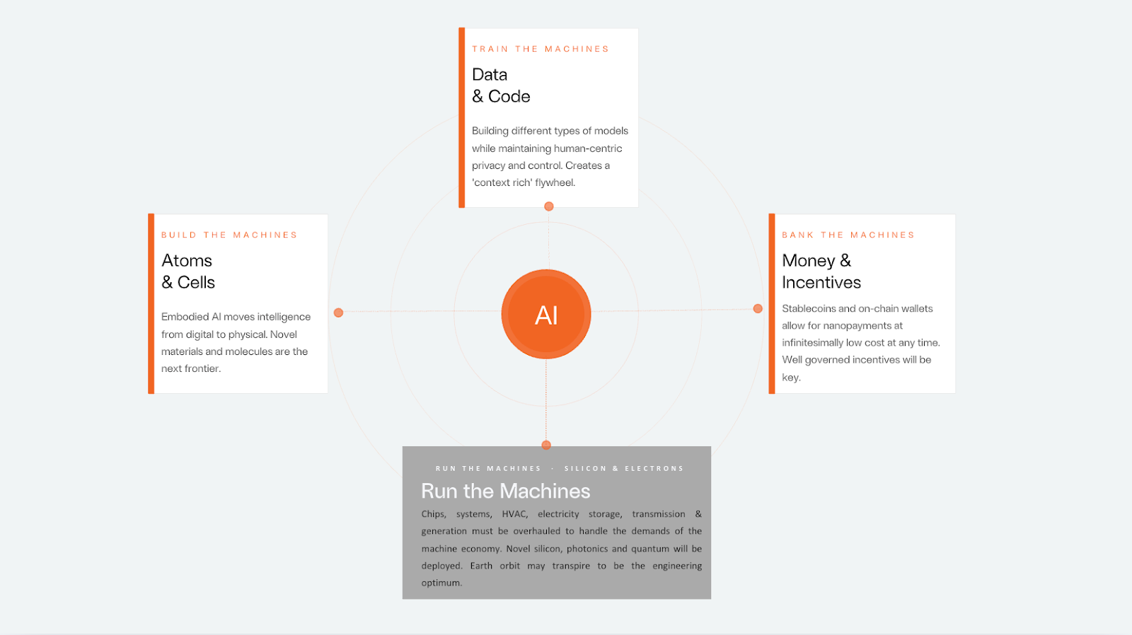Money & payments have always been the coordination signal: programmable value networks, or blockchains, are money that moves at the speed of machine decision-making, not human settlement cycles. Energy, expressed as value, can now travel around the world at the speed of light and negligible cost. Stablecoins, wallets, smart contracts, and token protocols form the nervous system through which machines coordinate economically. With these interfaces to economic reality, models can act in the financial world. They can secure resources, earn their own money, build their own credit record, be held accountable and use these to drive their own self-improvement.